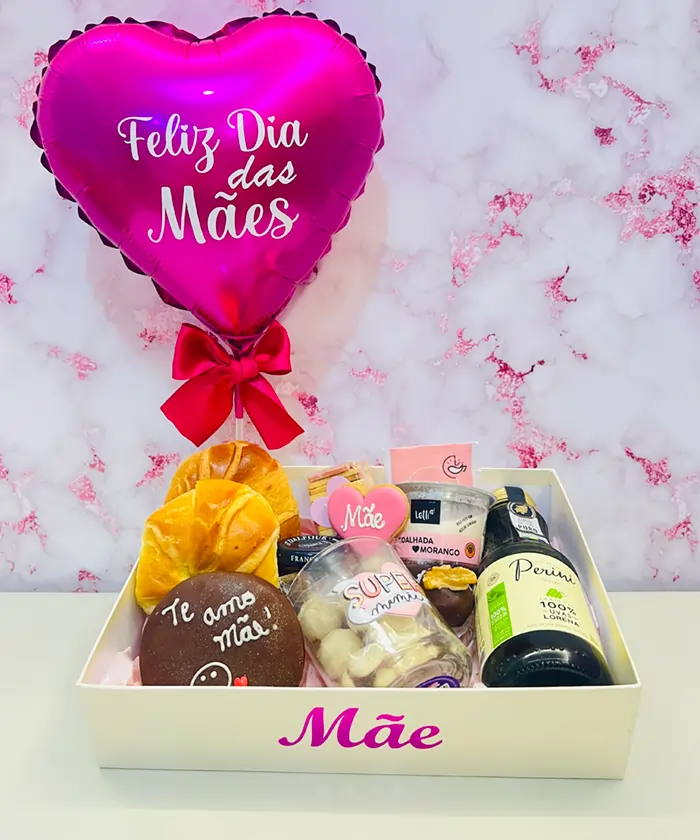 Caixa cartonada Caneca para Mãe Suco de uva branco integral Chá envelopado Coalhada morango Pct torrada slim Tost Bolacha personalizada Mãe Amanteigados Alfajor personalizado Mãe Pães tipo Croissants Mini geleia importada 1 camafeu de nozes Balão personalizado Dia das mães Obs: Na falta de algum produto o mesmo pode ser substituído por outro do mesmo [...]